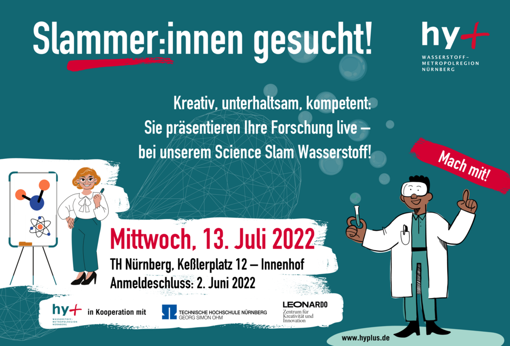 Um interessierte Bürger*innen auf kurzweilige und verständliche Weise an dieses vielfältige Zukunftsthema heranzuführen und Einblicke in aktuelle Forschungsaktivitäten vor Ort zu geben, veranstaltet die Wasserstoff-Metropolregion Nürnberg hy+ in Kooperation mit der Technischen Hochschule Nürnberg und LEONARDO – Zentrum für Kreativität und Innovation den Science Slam Wasserstoff.